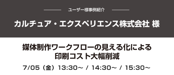 7月5日(金)には、会場にカルチュア・エクスペリエンス株式会社 様をお招きして、「媒体制作ワークフローの見える化による印刷コスト大幅削減」というテーマでユーザー活用事例をご紹介いただく、特別セッションを行います。